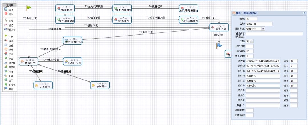 便利蜂可根据自身业务流程设置语音导航,客户来电时,通过语音提示按键选择进入所需的服务层级,寻求到有针对性的一对一服务。IVR语音流程可以利用图形化编辑器进行拖拽式编辑,在不同时段可执行不同语音流程的播报(如:上下班工作日及非工作日等)。